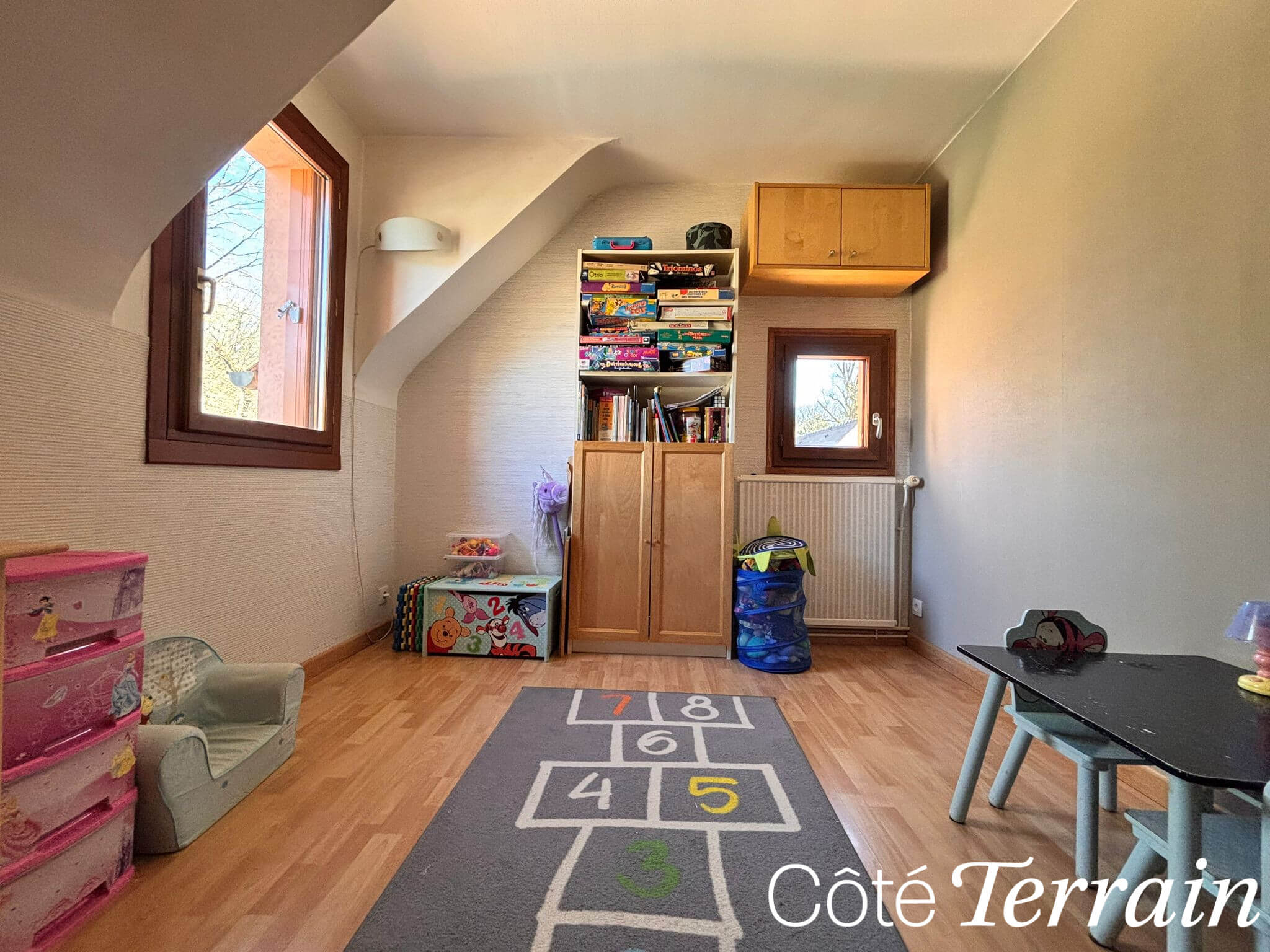 À l’étage, l’espace nuit propose trois chambres, idéales pour les enfants, un bureau ou une salle de loisirs. Une salle de douche et des WC séparés complètent cet étage, offrant praticité et confort pour toute la famille.