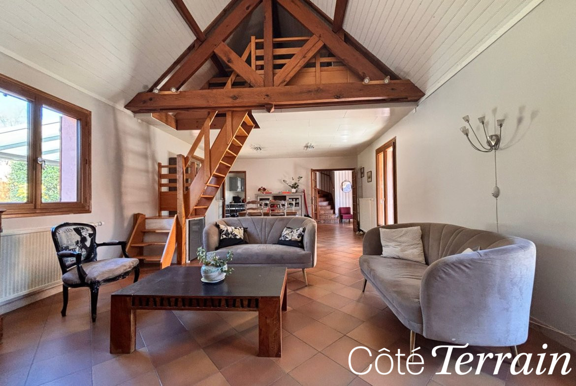 À l’extérieur, le jardin paysager, les arbres fruitiers et la piscine créent un véritable espace de vie en plein air, propice aux moments de détente et aux loisirs. La proximité de la forêt invite à de longues balades et à la découverte de la nature au quotidien.